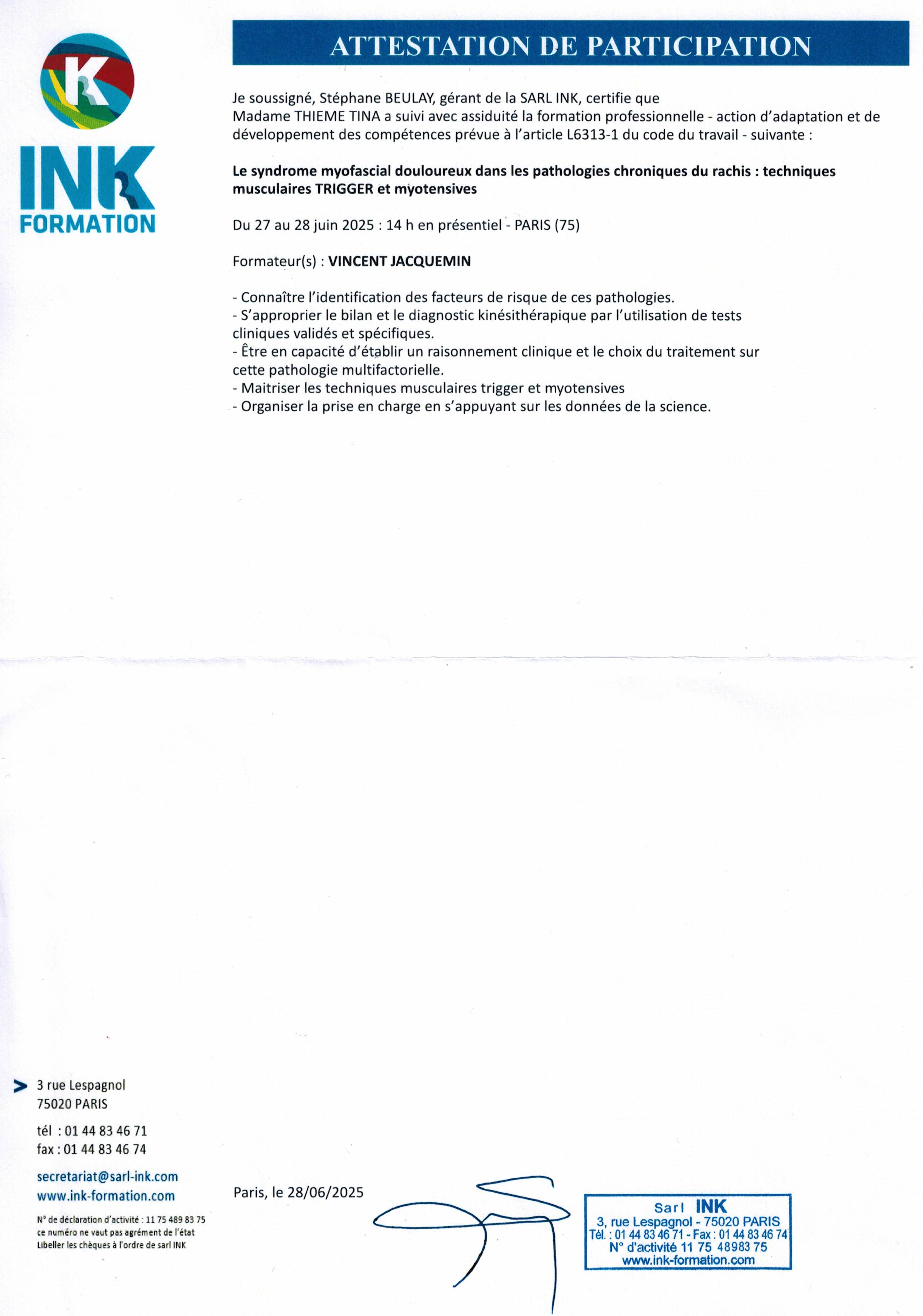 Certificat de stage en « Évaluation et traitement de l'adulte avec atteinte neurologique centrales, AVC, SEP, Syndrome ataxique et parkinsonien - Concept BOBATH » IBITA/ NER21 international
